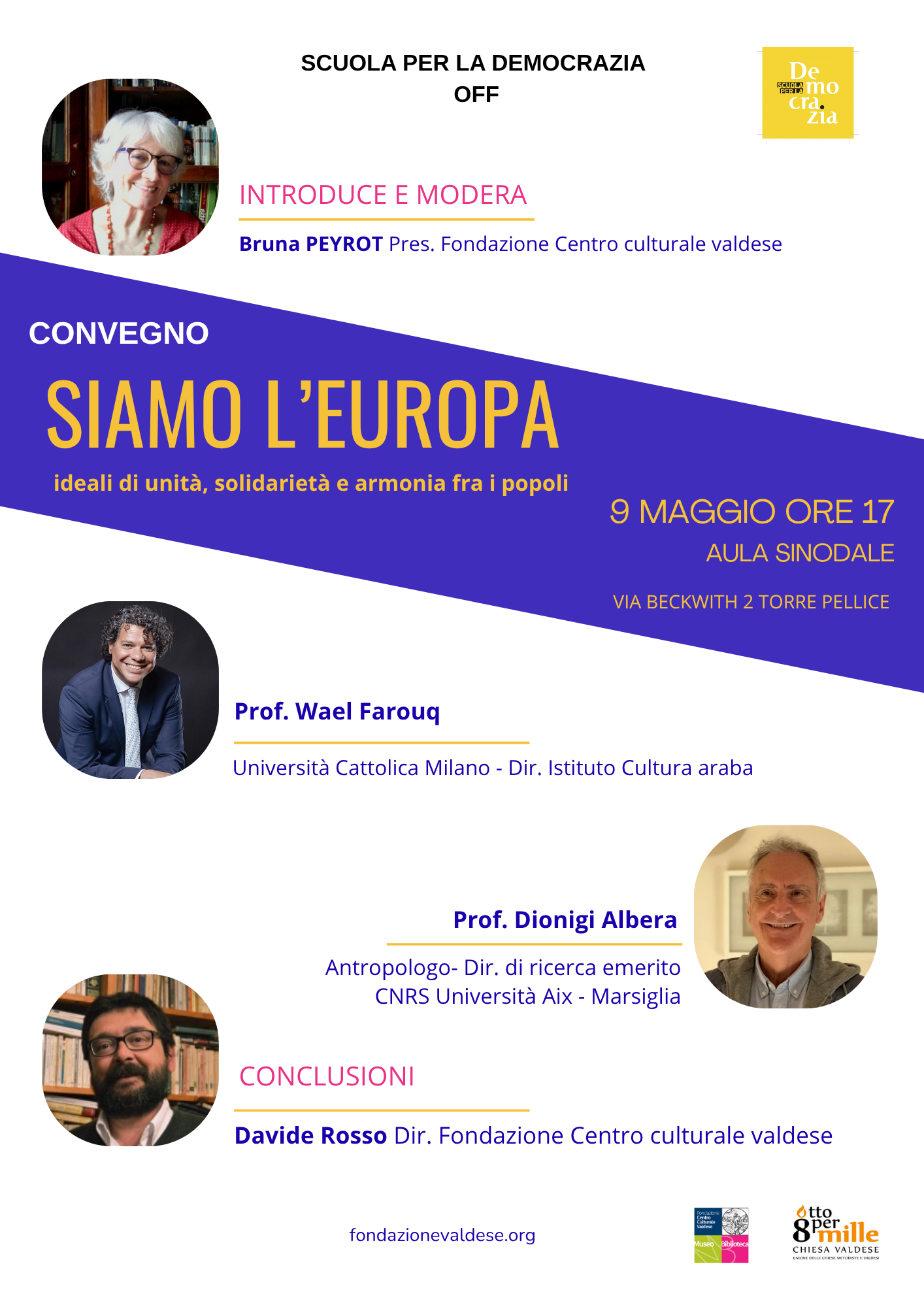 9 MAGGIO ORE 17 AULA SINODALE – NELL’AMBITO DELLA SCUOLA PER LA DEMOCRAZIA OFF – CONVEGNO “SIAMO L’EUROPA IDEALI DI UNITA’, SOLIDARIETA’, DI UNITA’ TRA I POPOLI